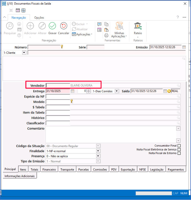Ao utilizar o parâmetro 00186, é possível definir se o campo de vendedor será livre, permitindo a escolha a cada emissão do documento fiscal ou se será fixado, mantendo sempre o vendedor para todos os documentos emitidos.