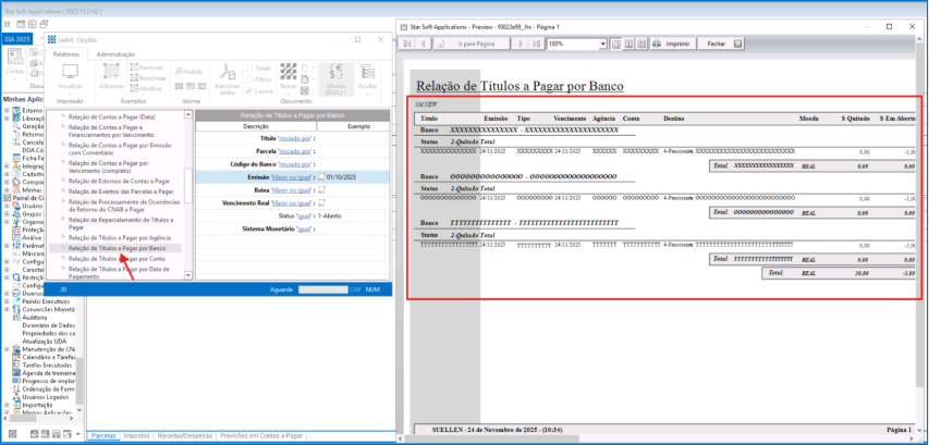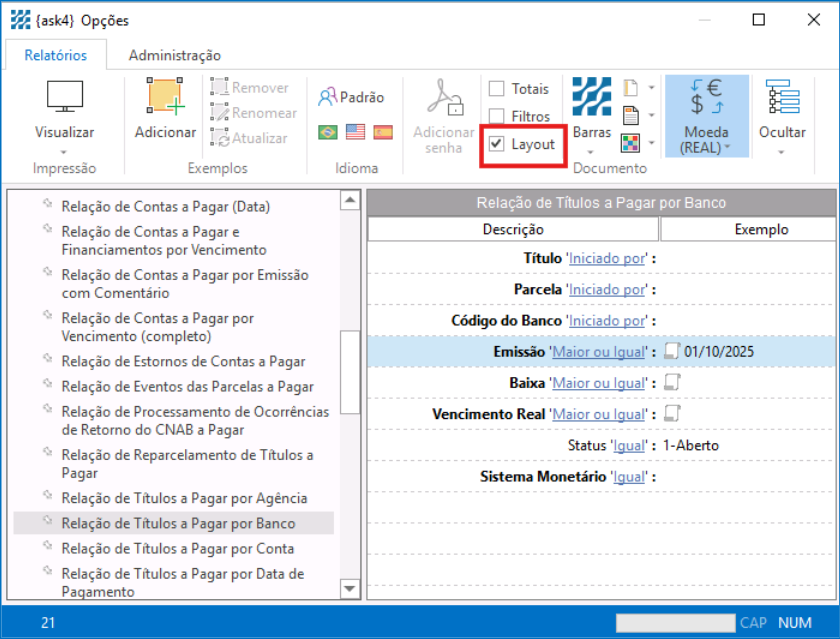 2- Para corrigir, acesse a tela de opções do relatório e desmarque a opção “Layout”.
