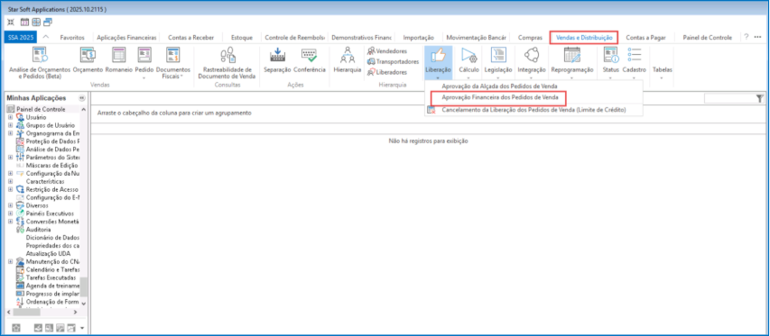 1. Acesso o módulo de Vendas e Distribuições, no menu Liberação, selecione a opção “Aprovação Financeira dos Pedidos de Venda”.