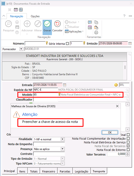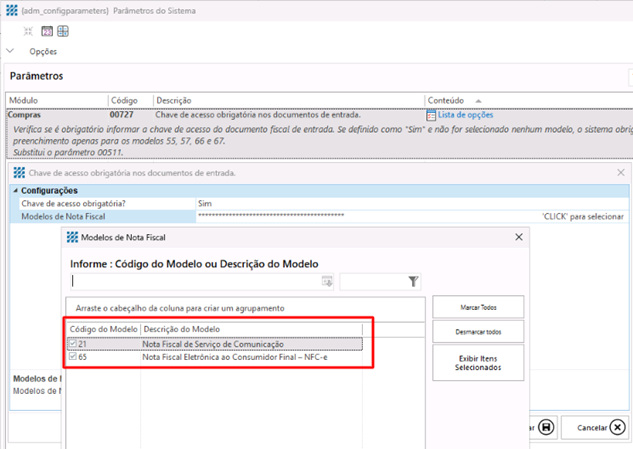 modelos definidos no parâmetro, o sistema irá impedir a gravação do documento
