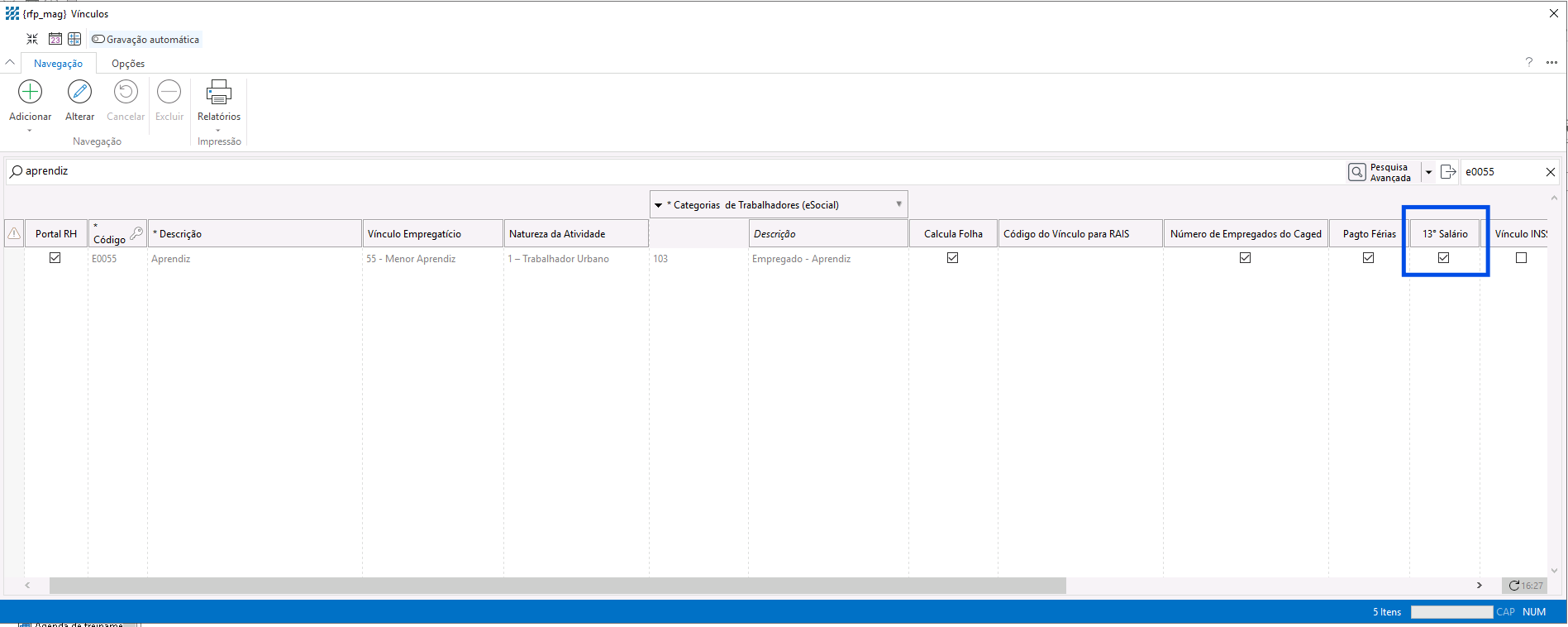 Acesse a tela Vínculos, a partir do menu Coaboradores e verifique se o campo “13º salario” está marcado para os vinculos utilizados pela empresa.