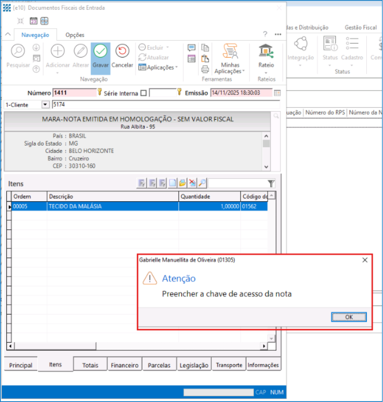 Ao tentar gravar uma nota de entrada sem informar a chave de acesso, o sistema exibirá uma mensagem alertando sobre a obrigatoriedade do preenchimento.