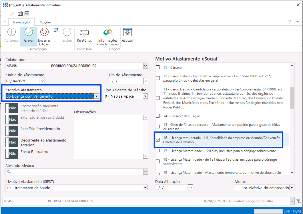 4) Motivo afastamento eSocial marque a opção 16-Licença remunerada