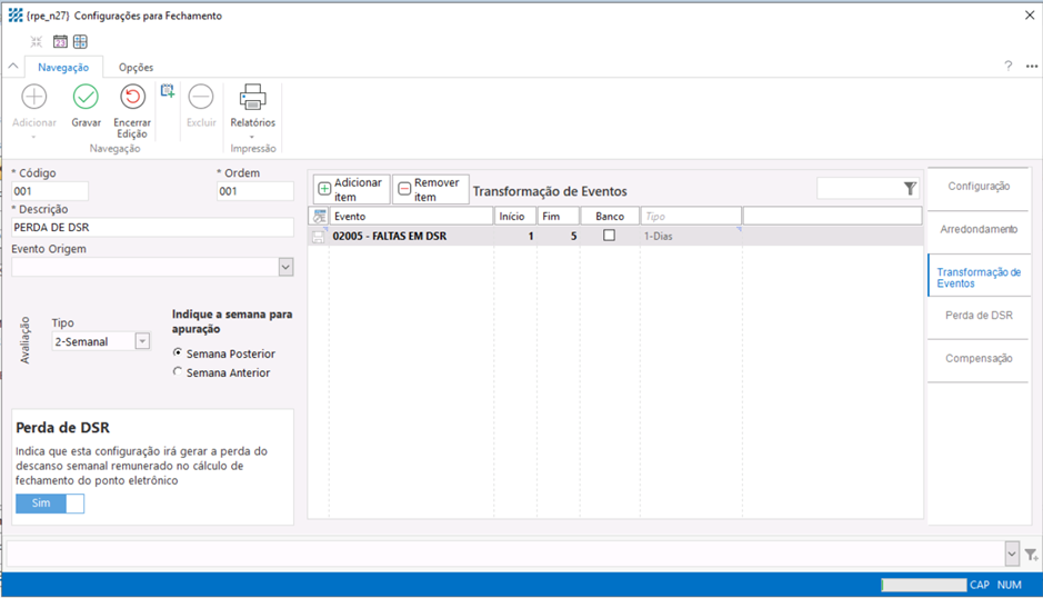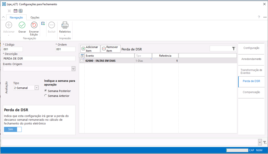 - Descrição: Informe uma descrição da configuração de fechamento. Exemplo: Perda de DSR.