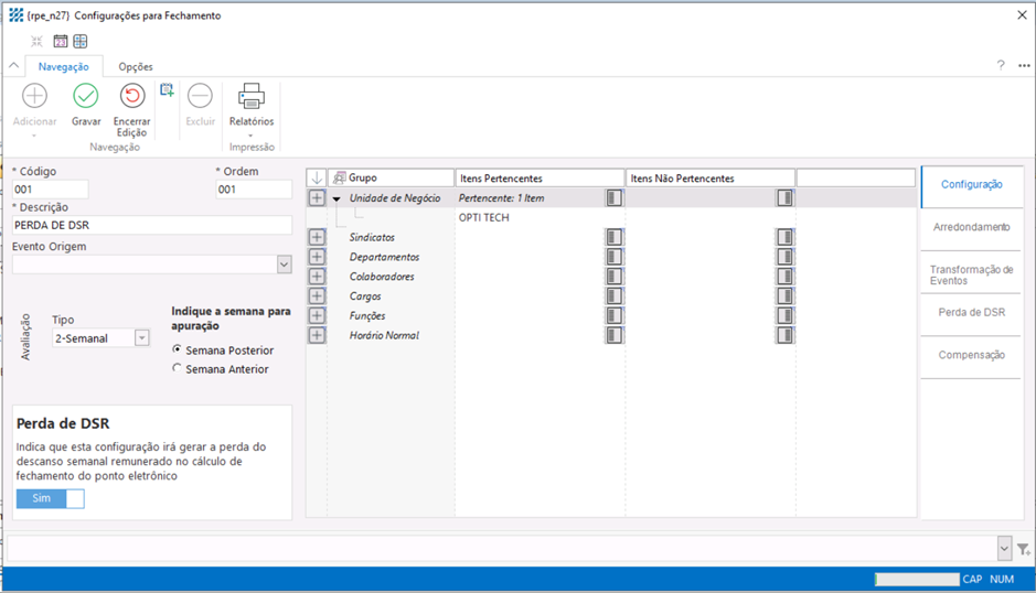 - Perda de DSR: Mantenha o campo Perda de DSR = Sim. Essa opção garante que a configuração gere a perda do DSR no fechamento do ponto eletrônico.