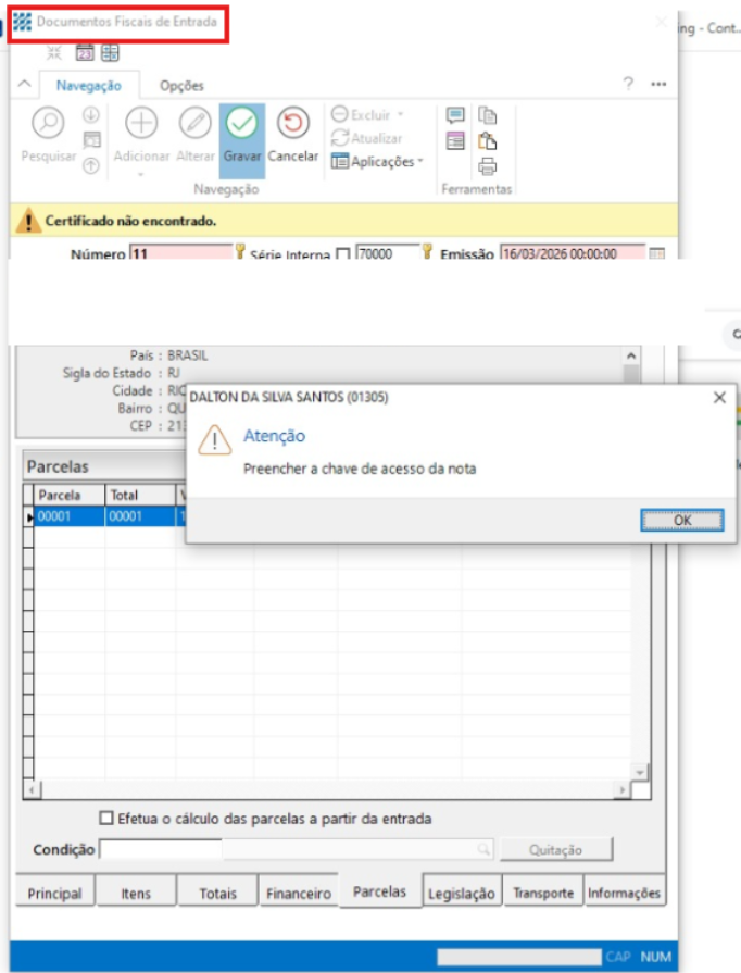 1 – Após preencher os dados para dar entrada na Nota Fiscal, ao realizar a gravação, caso seja exibida a mensagem “Preencher a chave de acesso da Nota”, significa que esse campo está configurado como obrigatório. Portanto, se não for informado, o sistema não permitirá a finalização do processo.