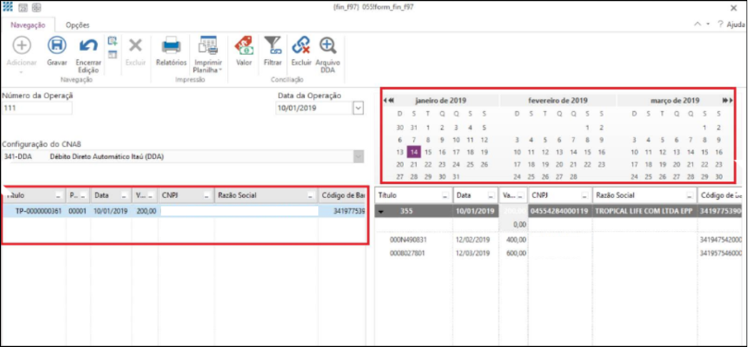 Na tela de DDA, preencha os seguintes campos obrigatórios: