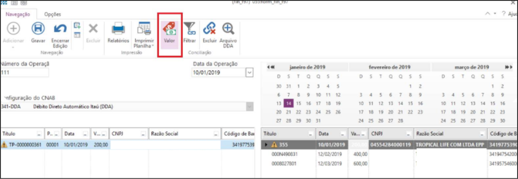 Clique no botão “Valor” para realizar a conciliação automática, que ocorre com base em CNPJ, valor e data de vencimento.
