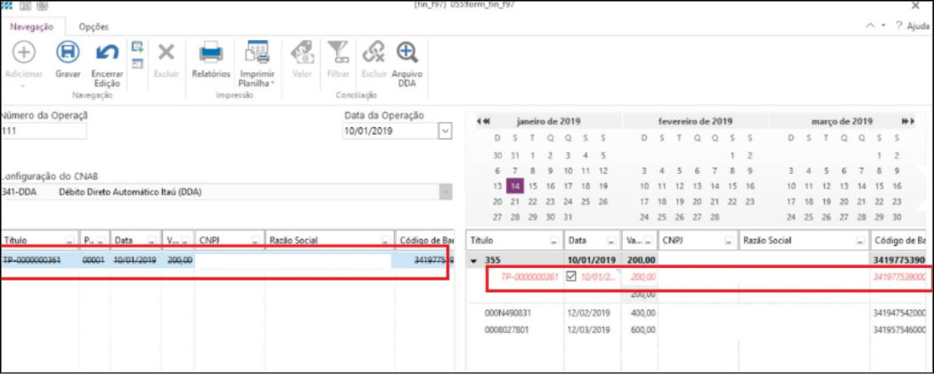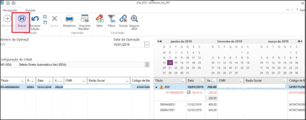 Após concluir a conciliação, ao gravar o registro, os códigos de barras contidos no arquivo DDA serão automaticamente atribuídos às parcelas selecionadas no Starsoft.