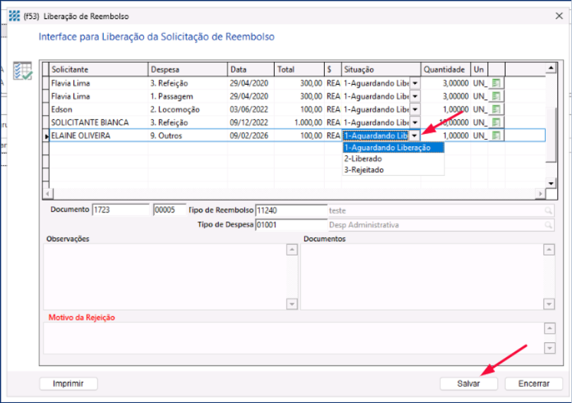 O campo Situação indica o status atual da despesa e é o campo que o liberador deve modificar para liberar ou rejeitar o reembolso e, em seguida, clique em Salvar.