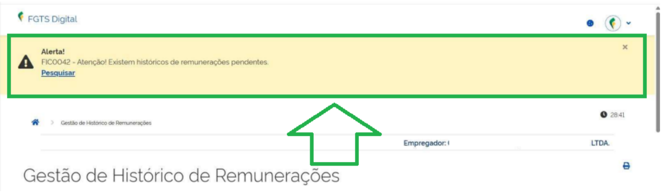 Ao acessar o FGTS Digital, e localizar a mensagem de pendência, se faz necessário clicar para visualização da