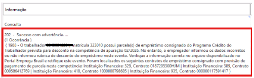 Se for identificada divergência em algum desses campos (Instituição Financeira ou Número do Contrato) ou a ausência de informação da rubrica de desconto do empréstimo no evento de remuneração, o empregador receberá uma mensagem de ADVERTÊNCIA no retorno do arquivo.