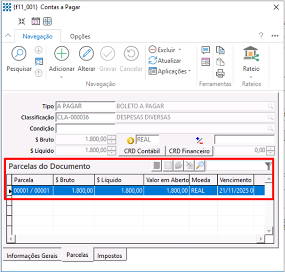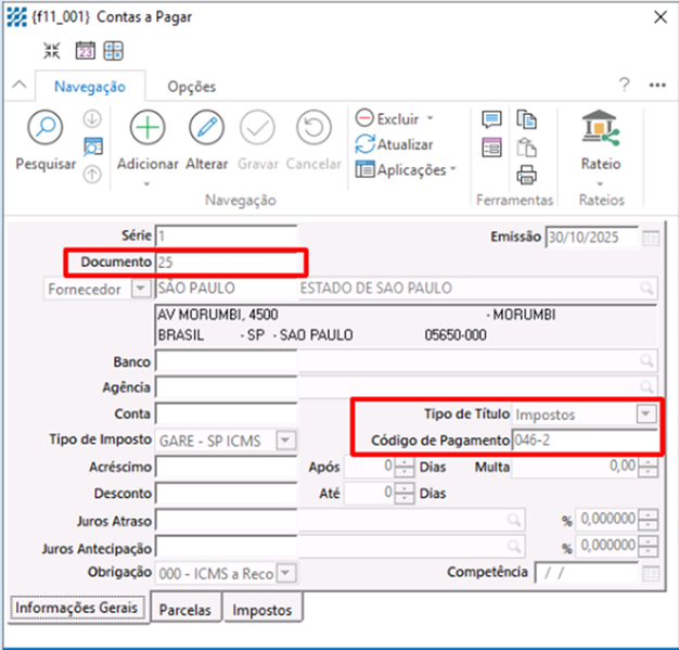 na geração do Contas a Pagar.