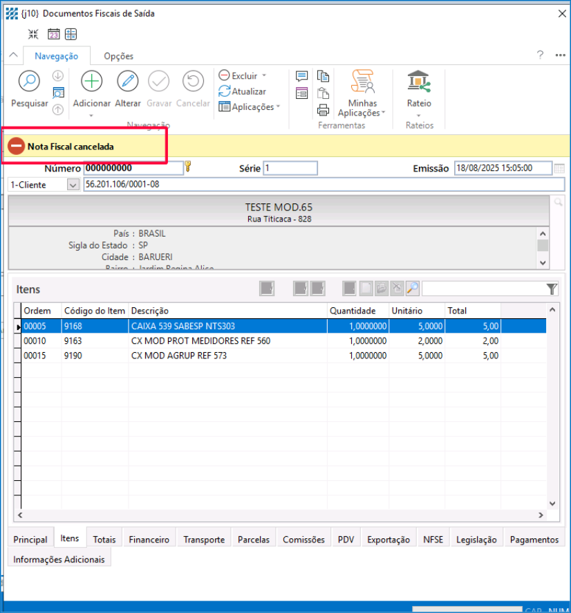 Conferência da Nota Fiscal com o Status de Cancelada.