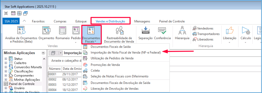 Vendas e Distribuição > Documentos Fiscais > Importação de Notas Fiscais de Venda (NF-e Federal).