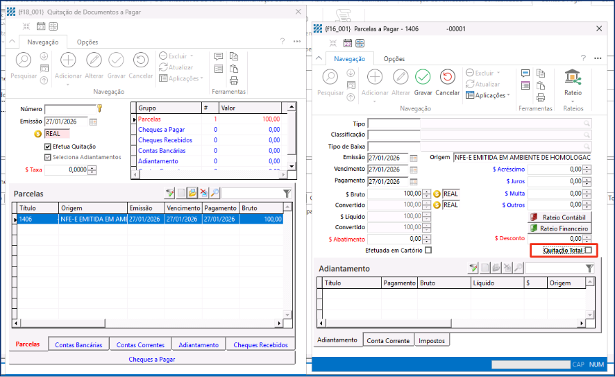 A quitação de um título a pagar com adiantamento funciona como uma compensação financeira, onde o valor pago antecipadamente é abatido do título em aberto. Caso, ao realizar a quitação, o adiantamento não seja localizado, é necessário verificar alguns pontos que podem estar impedindo sua identificação no sistema.