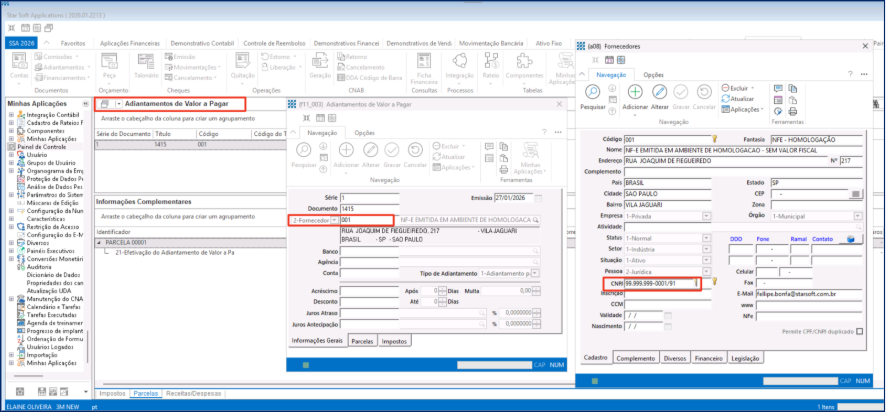 Verificar se o CNPJ que consta no título a Pagar/ Receber é o mesmo do adiantamento.
