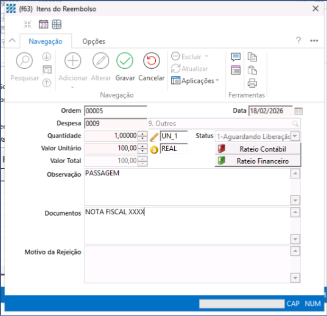 Tipo de Reembolso: que deve ter sido previamente cadastrado;