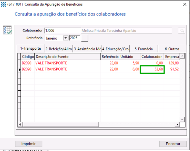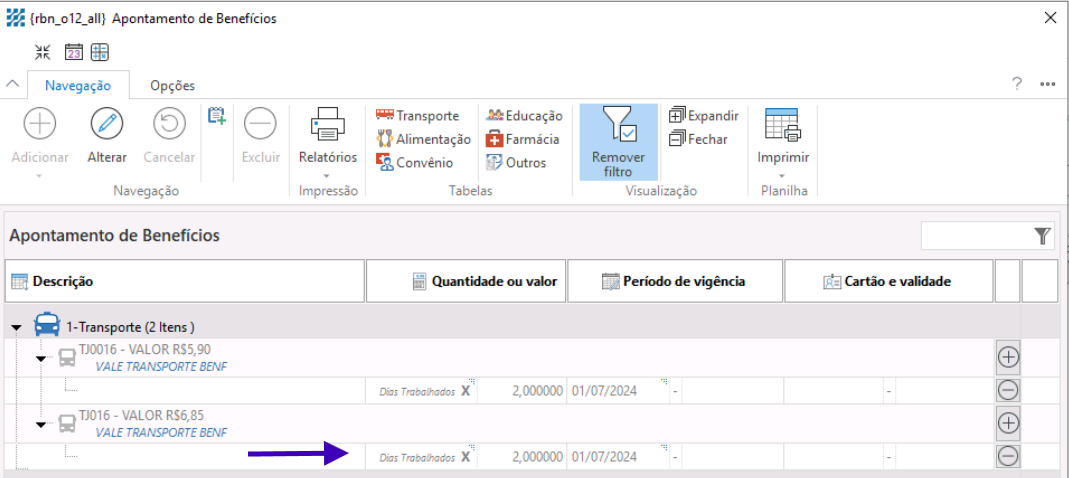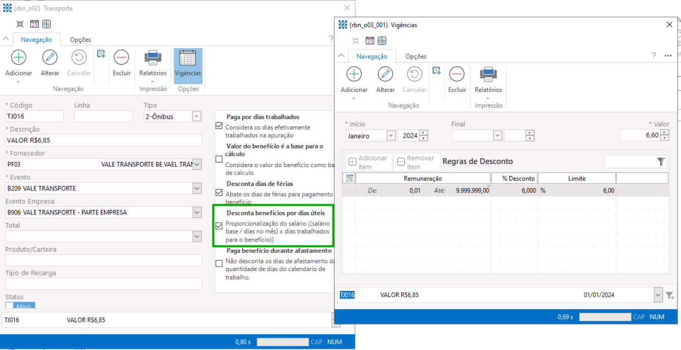 Benefício VT cadastrado com flag Desconta Benefícios por dias úteis marcado
