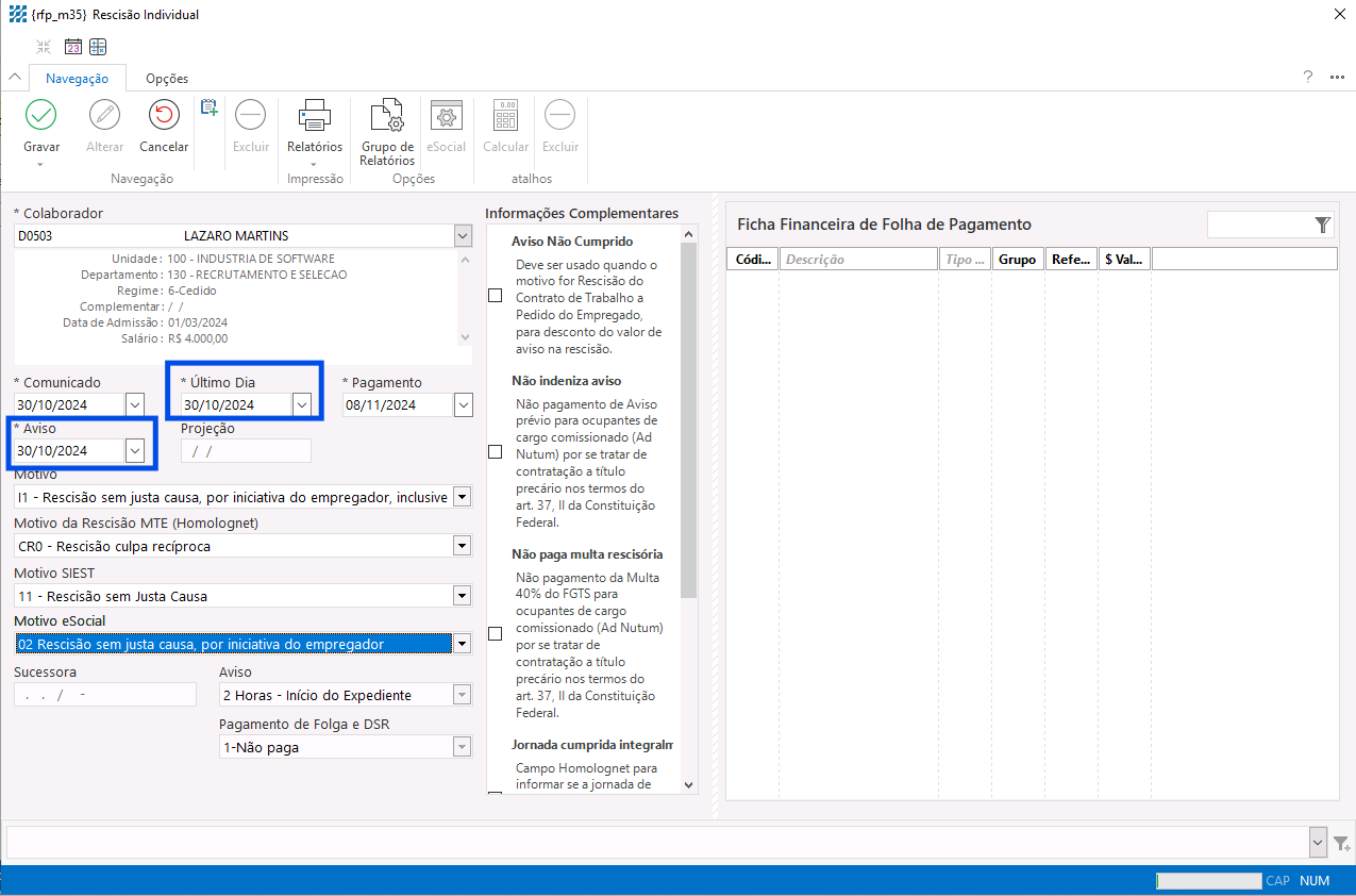 Para uma rescisão sem justa causa com aviso indenizado os campos data do aviso e último dia, devem apresentar a mesma data.